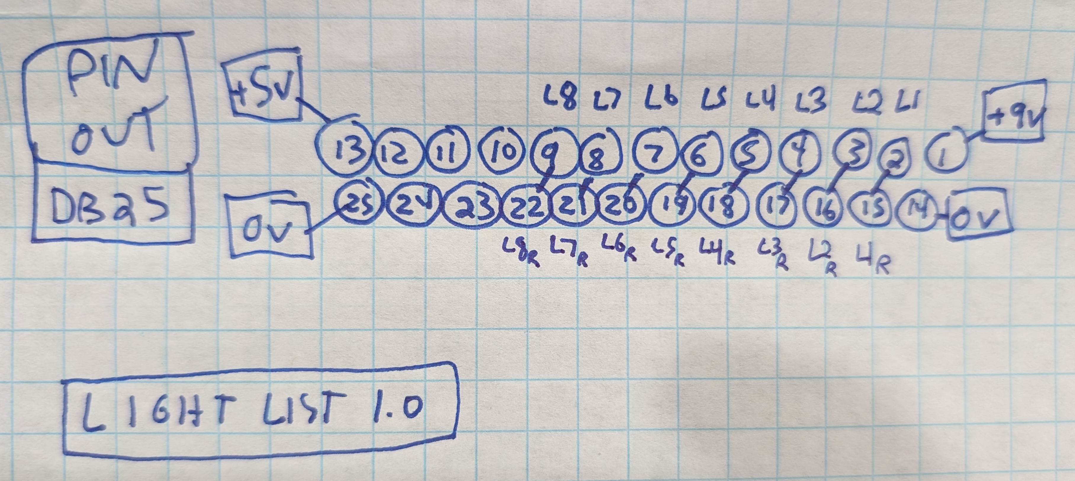 - Outermost pins (13, 1) carry constant 5v and 9v power, with pins 25 and 14 connected to ground.