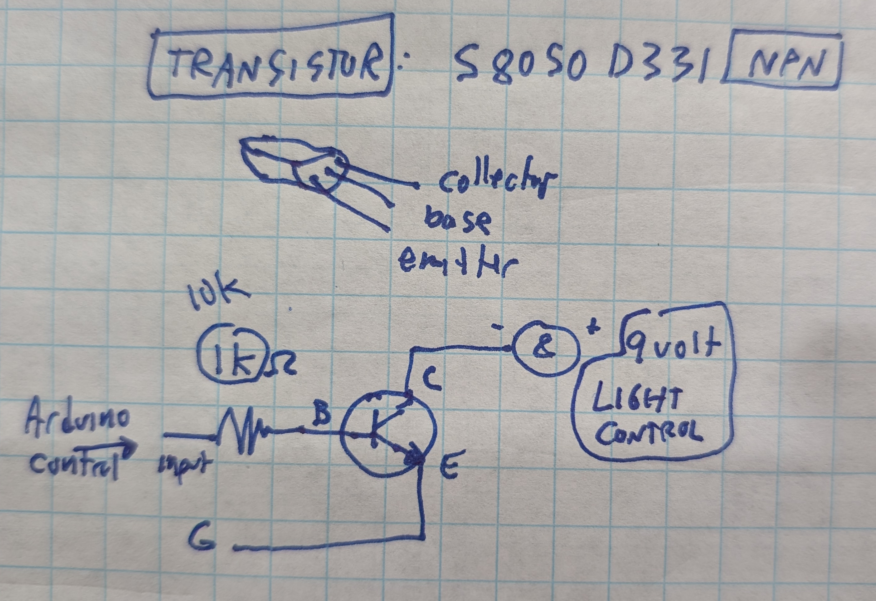 - The other pole of the light is connected to a constant 9v line. When the Arduino raises the voltage level on the base line, this opens up the transitor switch, completing the light circuit through the ground line, and allowing the 9v circuit to flow (and power the light).